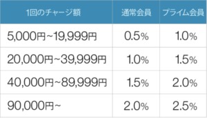 ・現金で残高追加するたびポイントが貯まる 通常会員は最大2.0% プライム会員は最大2.5%