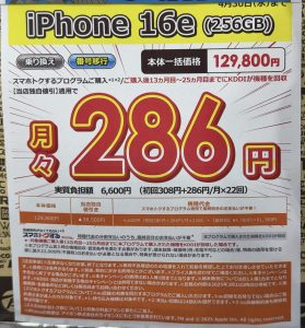 ビックカメラでauのiPhone 16eの256GBがMNPで3.8万円割引、2年後返却で実質6,600円