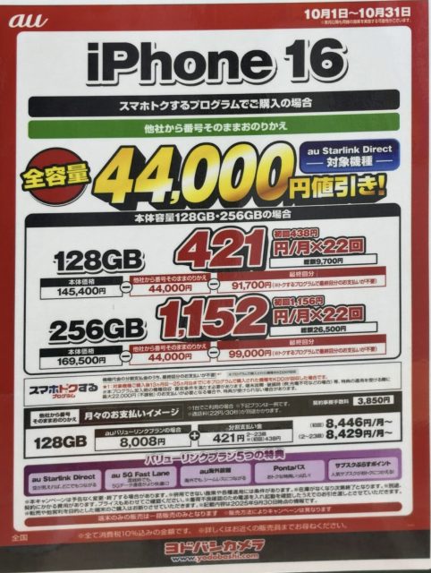 9月に続き、10月もヨドバシカメラにおいて、auのiPhone 16の128GBと256GBが割引で案内されている事を確認した。