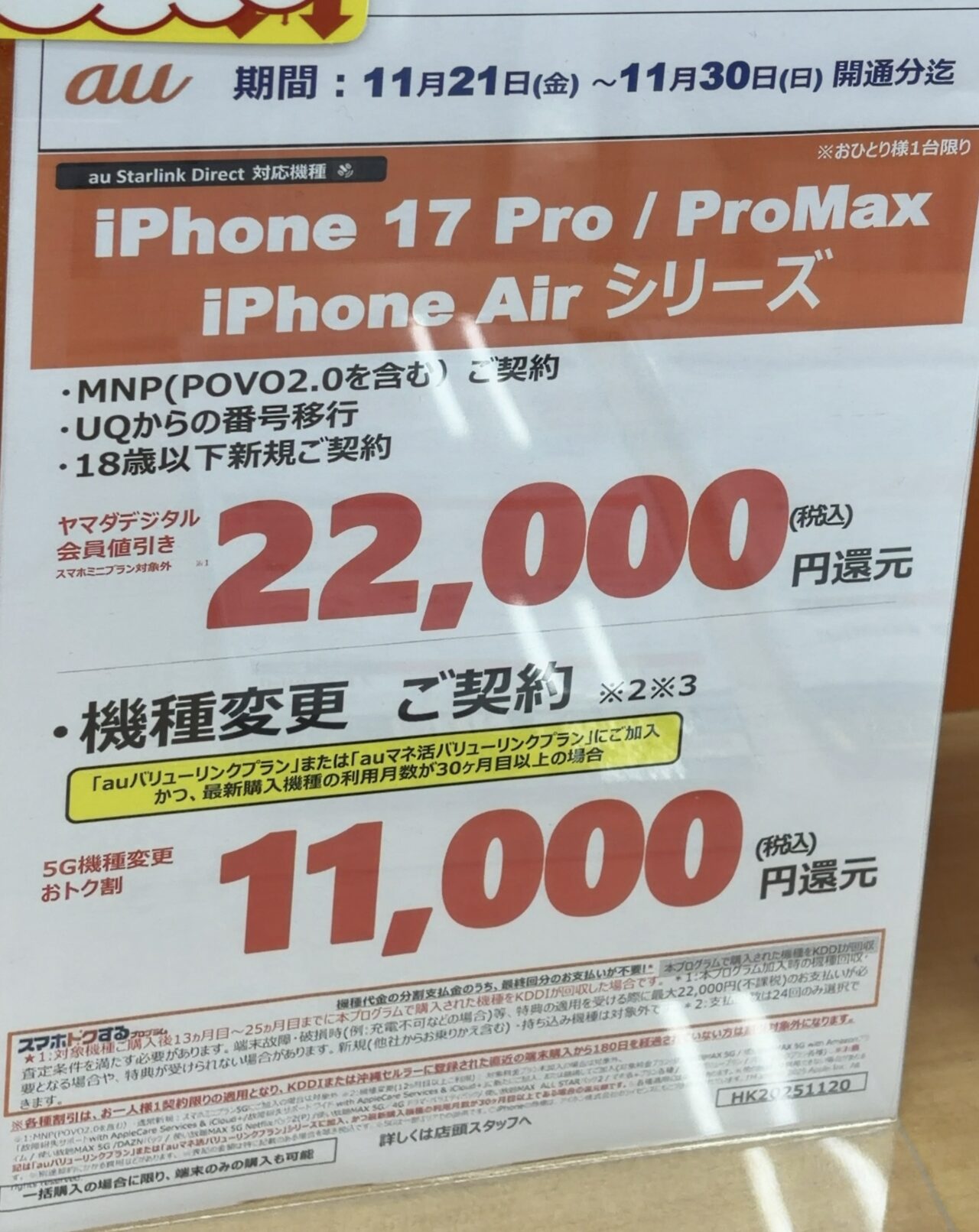 ヨドバシカメラにおいて、auのiPhone 17 Proが大幅割引で案内されている事を確認した。