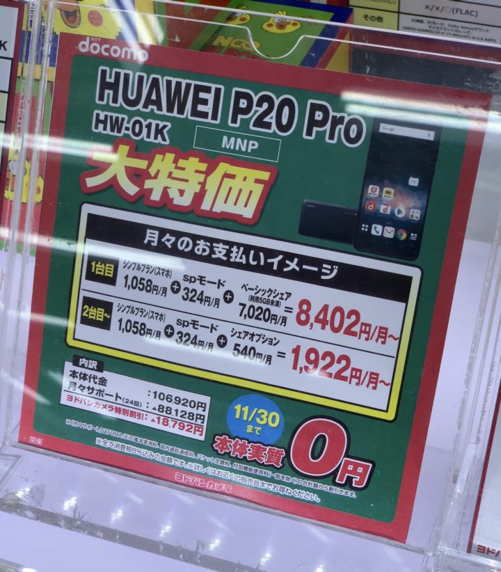 特にP20 ProはMNPだと月々サポートが発売時より3,672円/月までに増額していた。通常新規や機種変更でも3,321円/月と高額である。