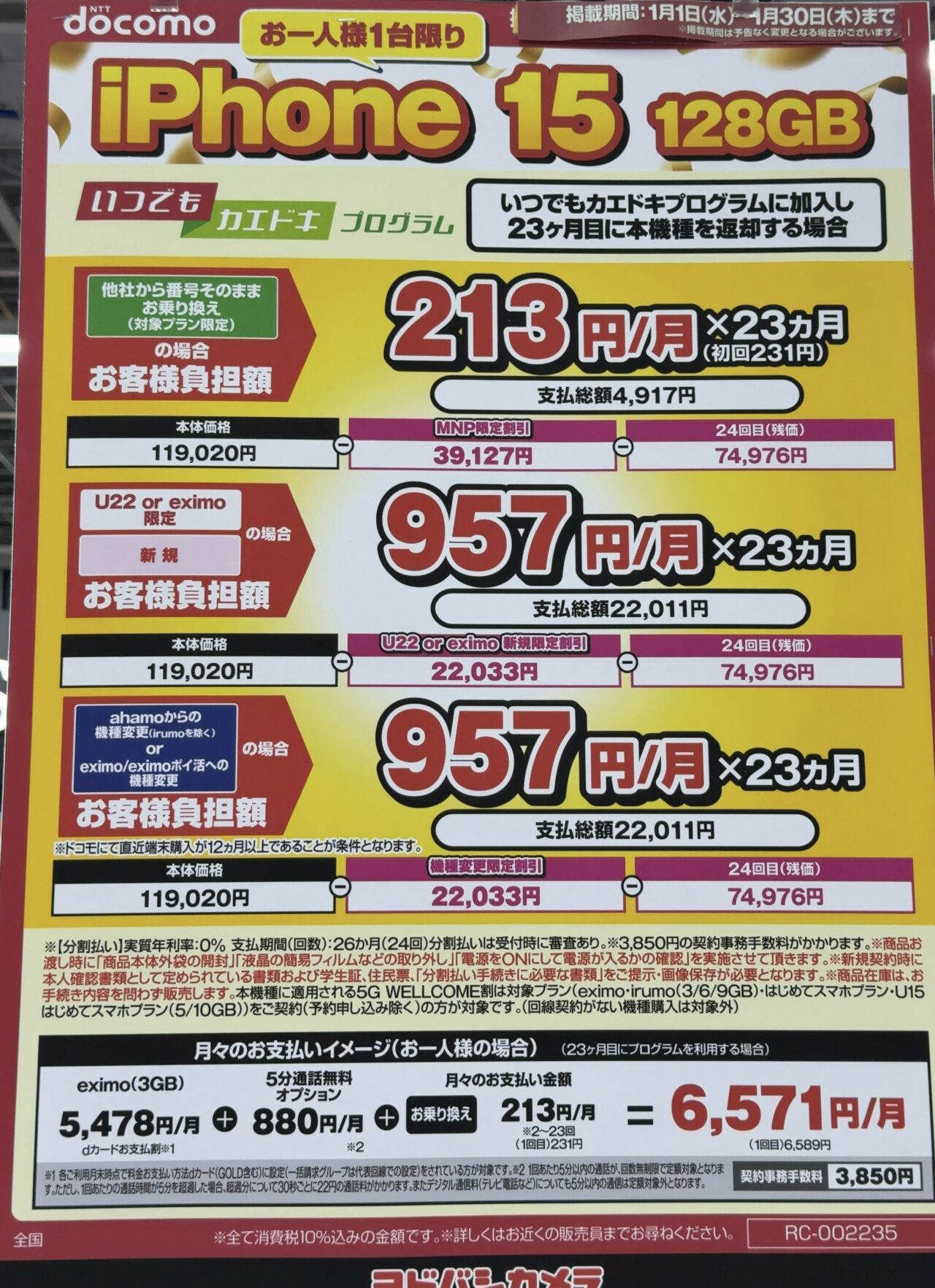 コジマ×ビックカメラでドコモのiPhone 15の128GBがMNPで7.9万円、後日機種返却で実質4,898円〜機種変更でも2.2万円引き