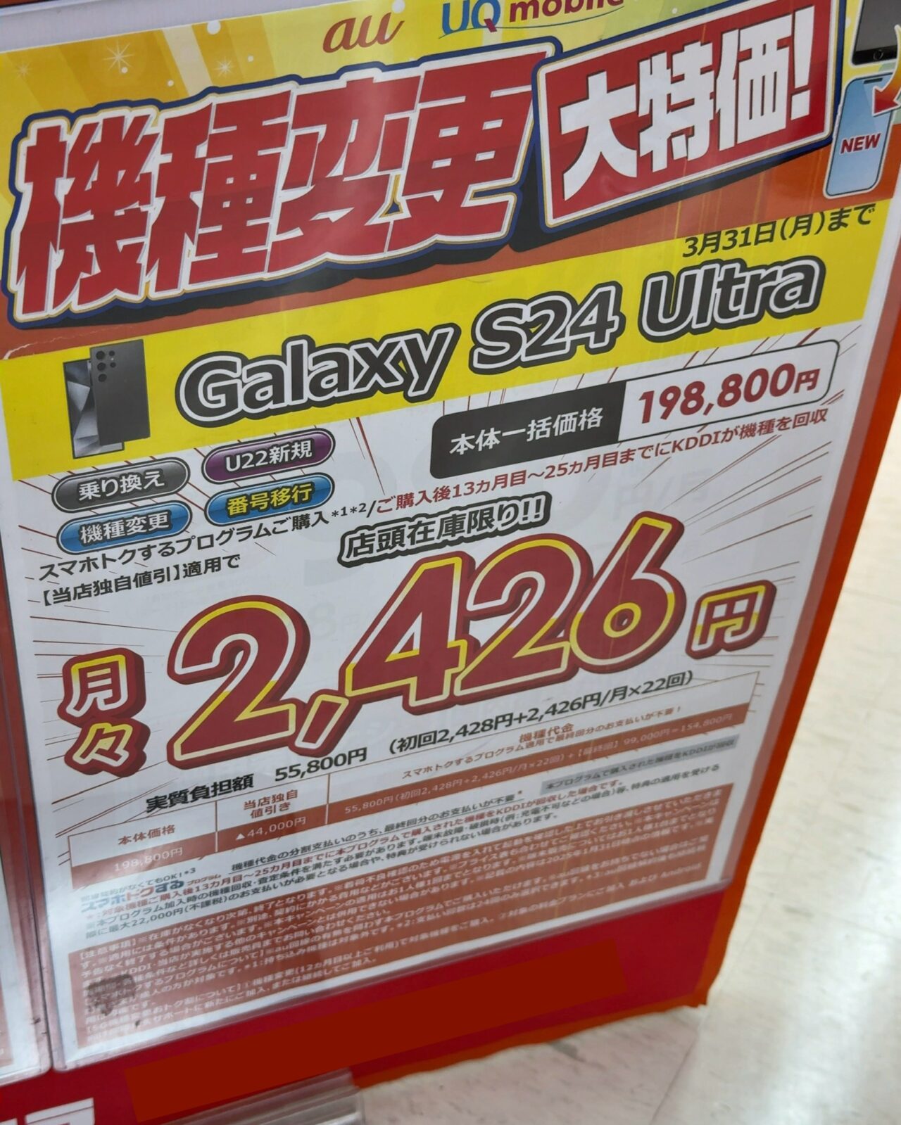 ・新規契約または機種変更で23ヶ月目にいつでもカエドキプログラムで機種返却:実質5,522円(店舗限定値引き▲38,500円+支払い不要▲65,736円)