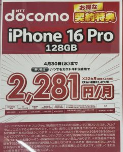 3月に続き、4月もビックカメラにおいて、ドコモのiPhone 16 Proが割引で案内されている事を確認した。