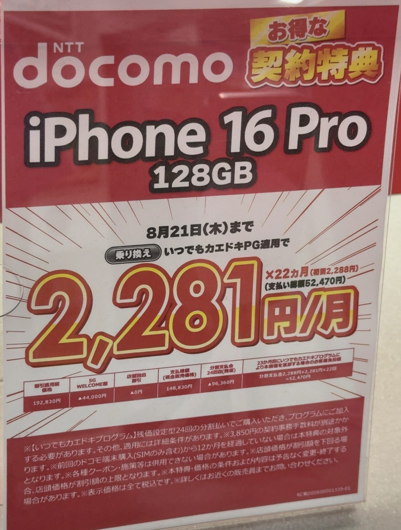 8月もヤマダデンキにおいて、割引で案内されているドコモのiPhone 16シリーズが、割引増額で案内されている事を確認した。