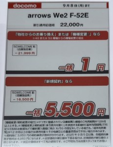 ジョーシンにおいて、ドコモのarrows We2 F-52EとGalaxy A25 SC-53Fが一括特価で案内されている事を確認した。