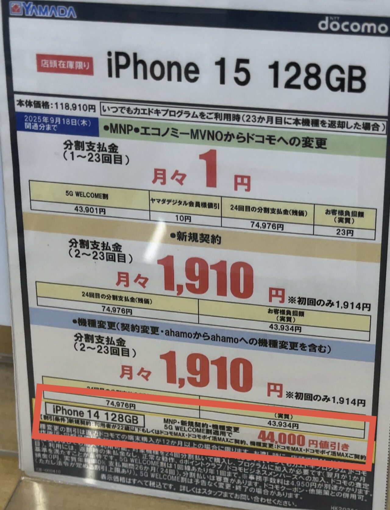 12月に安くなっていた時は、機種代金が9.5万円程で割引はMNPで4.3万円程だった。