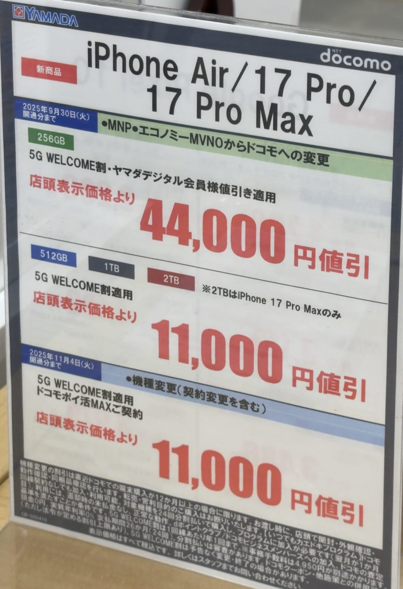 ・機種代金値下げのドコモのiPhone 16の128GBがヤマダデンキで機種変更で3.3万円割引で8.5万円、2年後返却で実質1.1万円に
