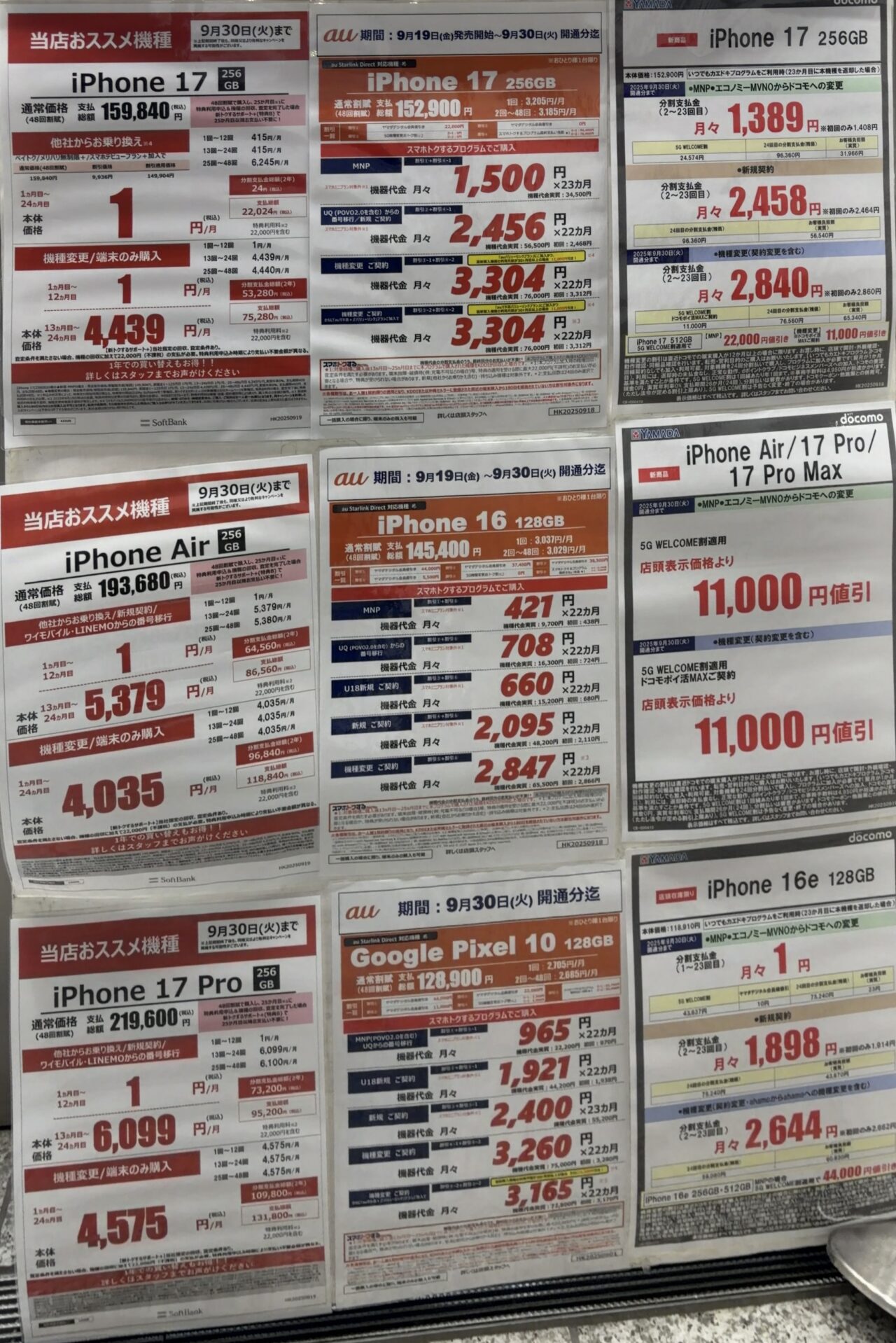 ヤマダデンキにおいて、発売直後のドコモのiPhone 17シリーズとAirが大幅割引で案内されている事を確認した。