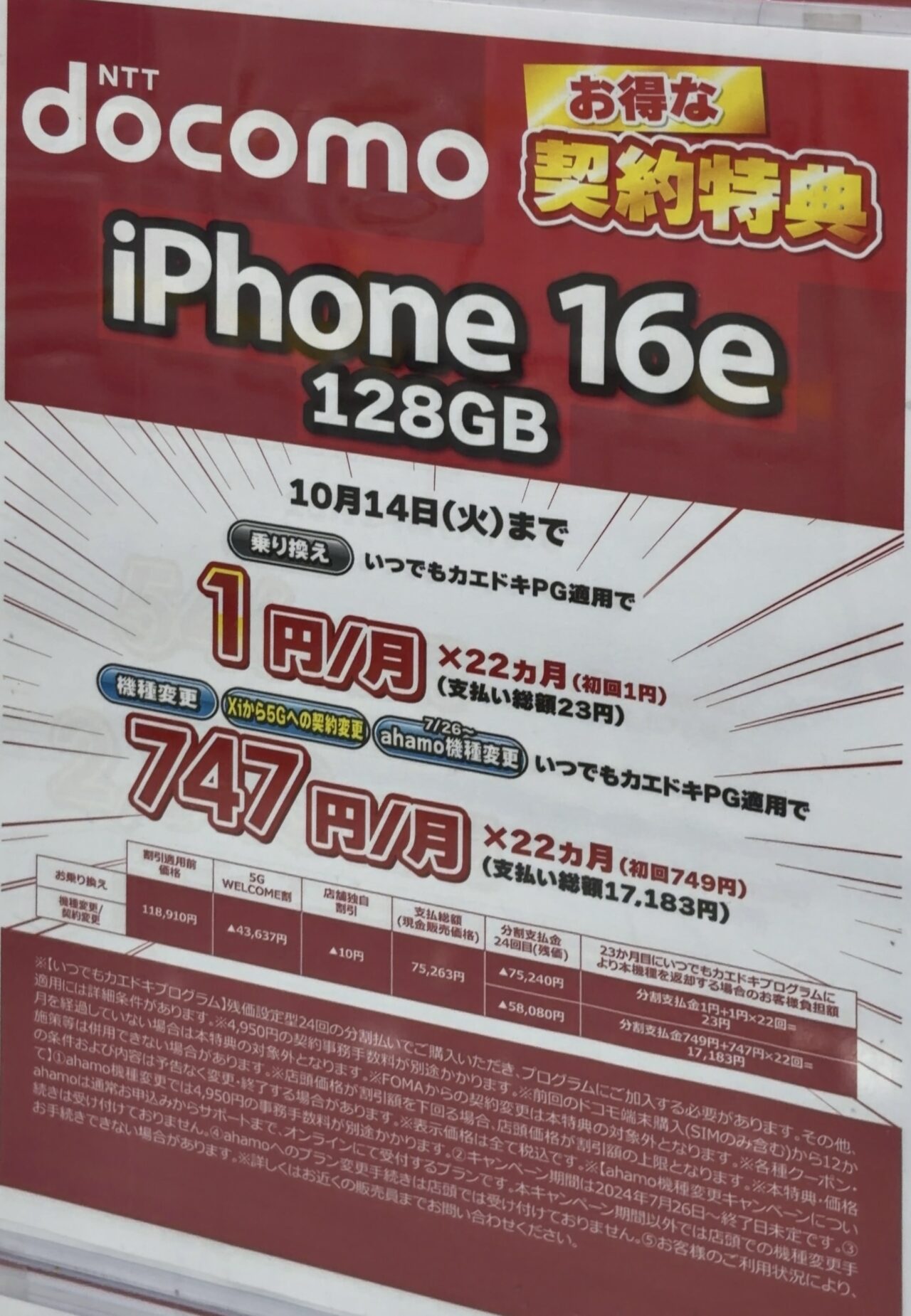 ・MNPで23ヶ月目にいつでもカエドキプログラムで機種返却:実質55,550円(MNP限定割引▲22,000円+店舗特別値引▲22,000円+支払い不要額▲100,320円)