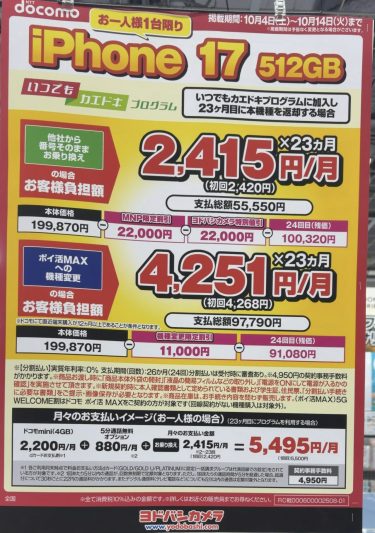 ヨドバシカメラでドコモのiPhone 17の512GBがMNPで4.4万円割引で15.5万円、2年後機種返却で実質5.5万円に