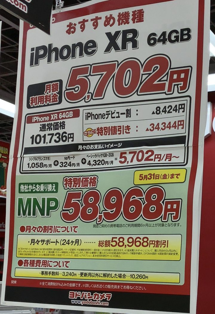 ヤマダ電機でドコモのiPhone XRがMNPで全容量実質0円で案内を確認〜ただし128GBと256GBは下取り含む