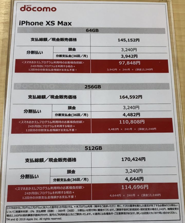 先日紹介したGalaxy S9同様、iPhone XSとXS Maxの512GBモデルにおいても値下げが行われ、店頭でも値下げ価格での案内を確認できた。