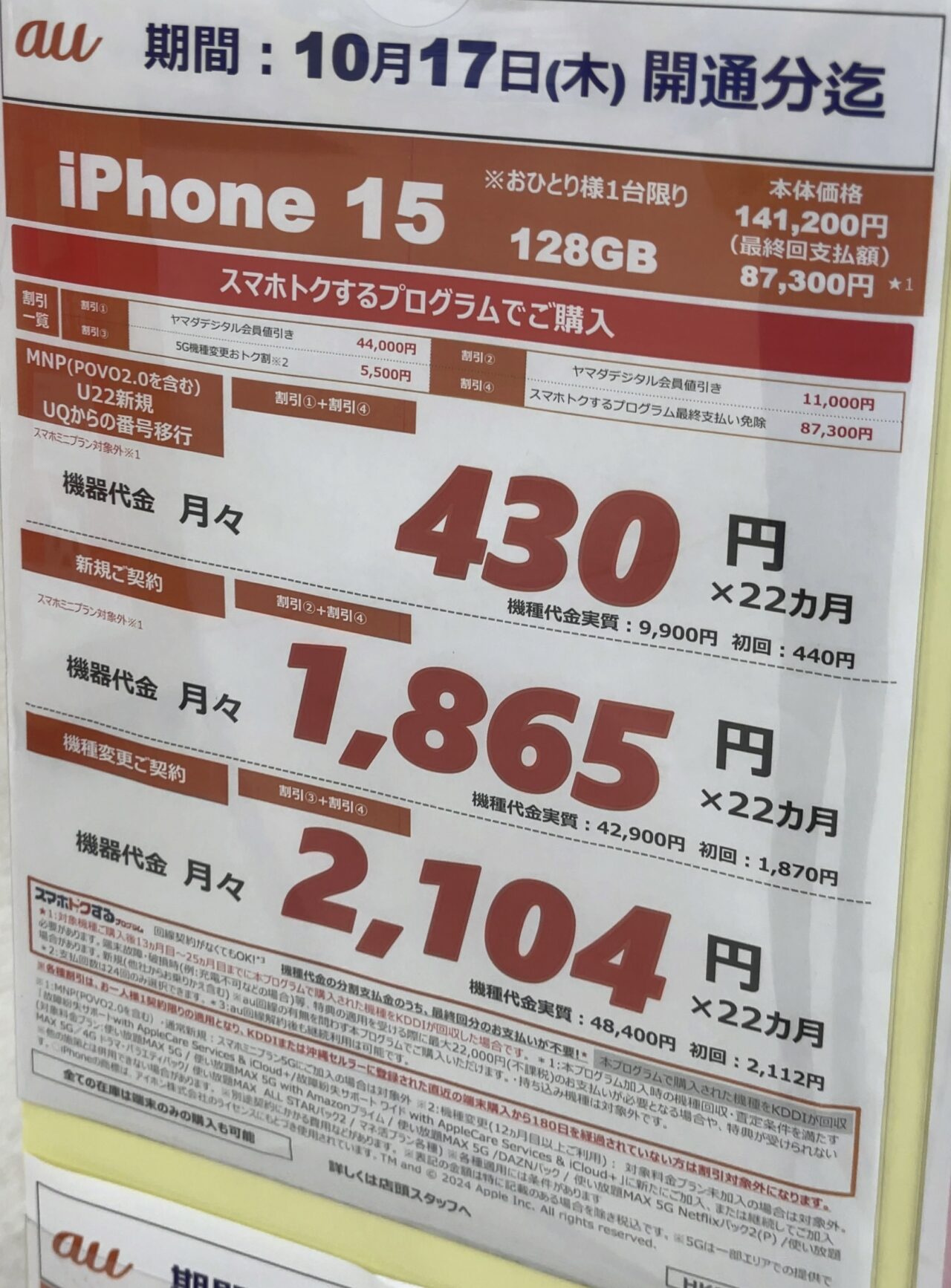 ※ドコモ/au/ソフトバンクのiPhone 15の値下げ価格の案内を追記(10/14(月))