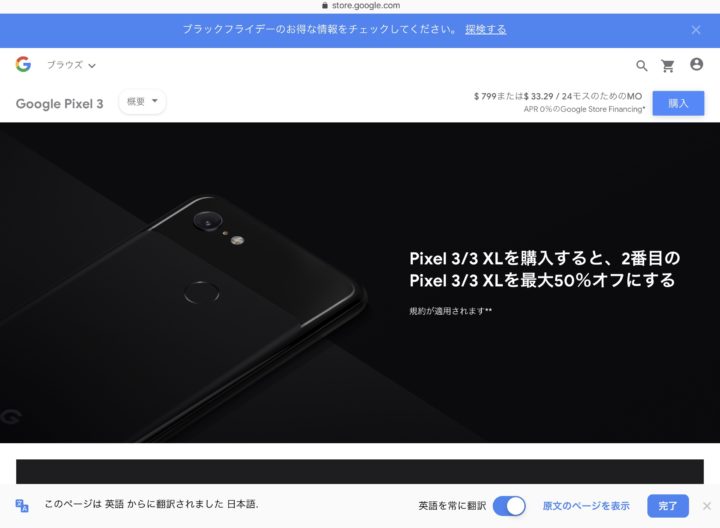 ※ブラックフライデーは11/22(金)の17時頃から始まったが、結局Pixel 3/3 XLはセール対象にならなかった。セールは11/24(日)まで開催(時間までは不明)