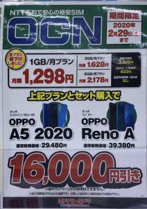 ・OPPO Reno A:音声SIMとセットで16,000円引き
