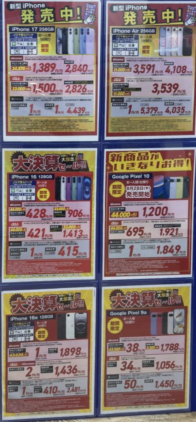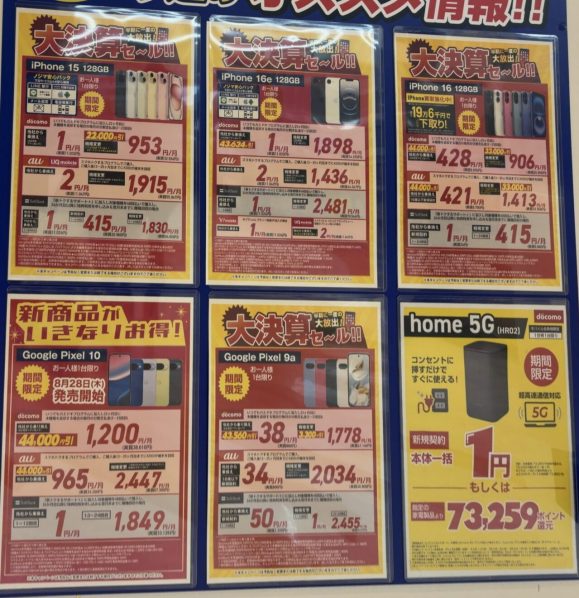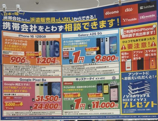 【2025/9版】ノジマでドコモ/au/ソフトバンク/UQモバイル/ワイモバイルのiPhone(16/16e/15) 、Android(Pixel/AQUOS/Galaxyなど)がMNPや新規で特価案内