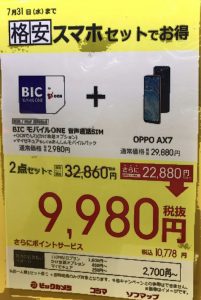6月も一部機種で行われていたが、ビックカメラにおいて、OPPOのR17 Pro/R15 Neo(メモリ3GBモデル)/AX7が、指定のMVNO(音声SIM)とセットで値引き販売されている事を確認した。