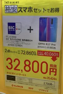 7月もビックカメラでOPPOのR17 Pro、R15 Neoなどが指定MVNOとセットで値引き販売〜7/31(水)まで