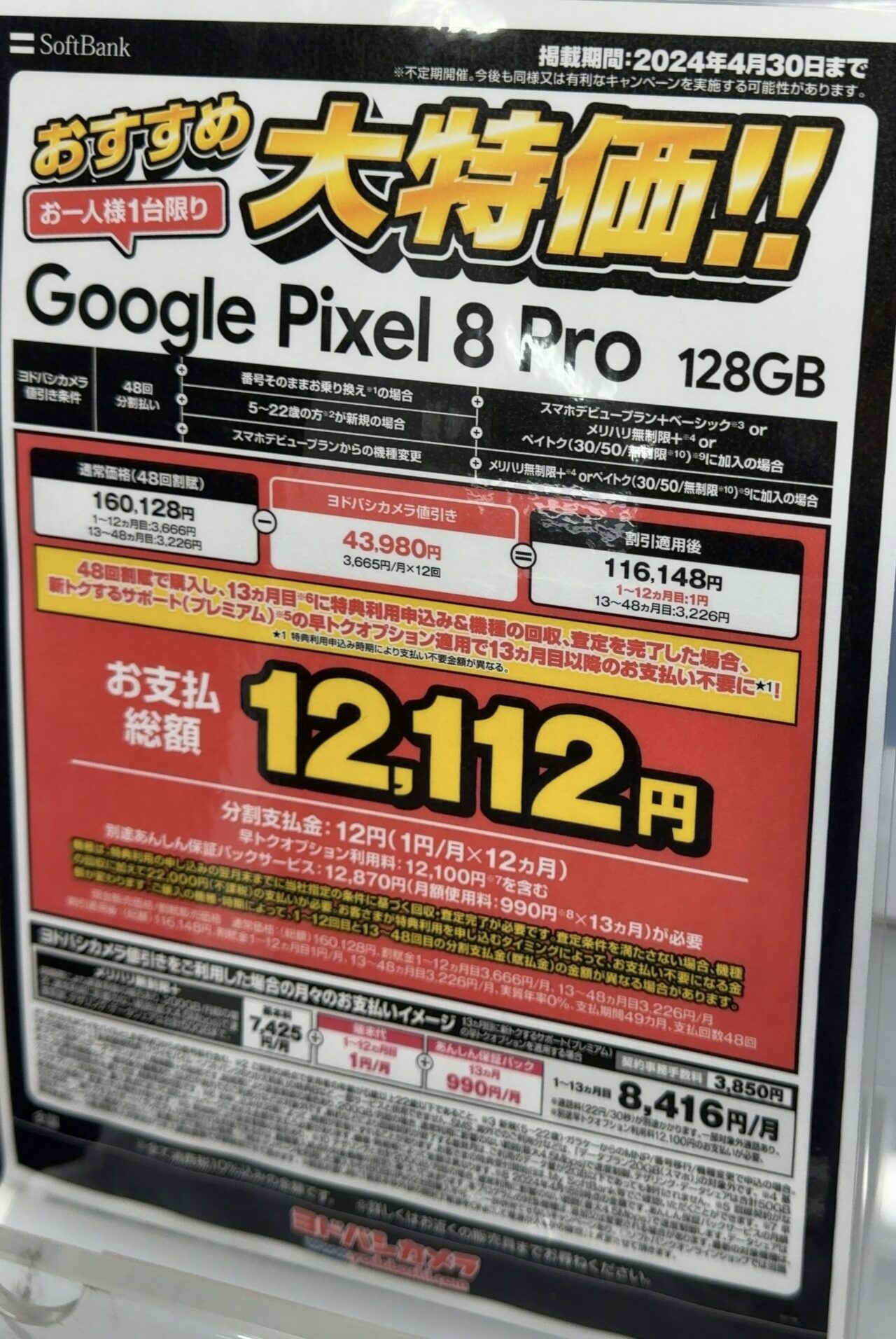 これまでソフトバンクでは実質12円や24円の場合、21,984円割引が多かったが、4万円超えの割引となっている。