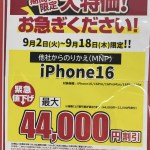 2025-08-16 / 最終更新日時 : 2025-09-08 SMB AppleエディオンでドコモのiPhone 16(Plus/Pro/Max/e含む)がMNPで最大4.4万円割引で案内 エディオンにおいて、ドコモのiPhone 16シリーズが割引で案内されている事を確認した。 期間は8/21(木)までとなる。 ※9/2(火)以降も案内を確認。こちら ※9/1(月)まで案内延長を確認 対象の契約はMNPで […]