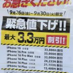 2025-09-29 / 最終更新日時 : 2025-09-29 SMB Apple機種代金値下げのドコモのiPhone 16の128GBがヤマダデンキで機種変更で3.3万円割引で8.5万円、2年後返却で実質1.1万円に 先日より機種代金が値下げしたドコモのiPhone 16が、ヤマダデンキにおいて機種変更でも大幅割引で紹介されている事を確認した。 期間は9/30(火)までとなっている。 確認できたのは128GBで、機種代金は145,20 […]