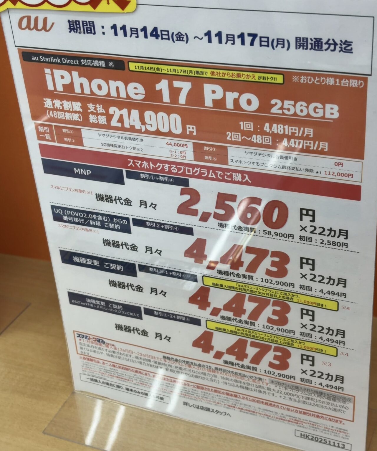 ・MNPで25ヶ月目までにスマホトクするプログラムで機種返却:実質47円(店舗独自値引き▲27,500円+支払い不要額▲33,453円)
