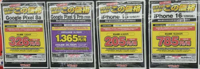 【12/26(木)〜】川崎ヨドバシで確認できたドコモ/au/ソフトバンク/ワイモバイル/UQモバイルのiPhone/Pixel/Xperia/AQUOS/OPPO/Xiaomi等の特価案内とiPhone 16の在庫状況