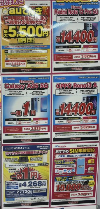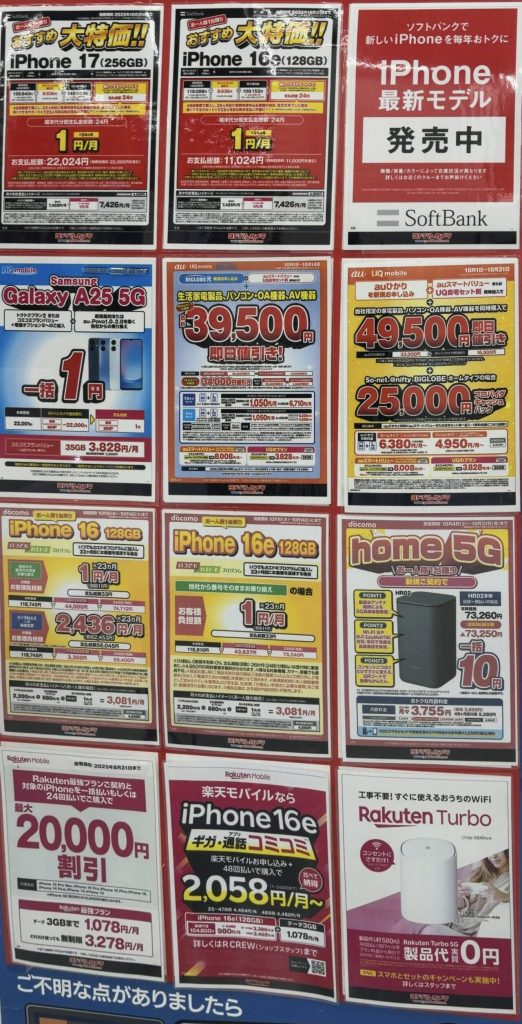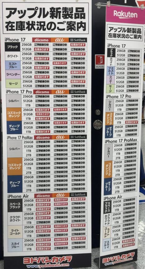 【2025/10版】横浜ヨドバシで確認できたドコモ/au/ソフトバンク/ワイモバイル/UQモバイル/楽天モバイルのiPhone/Androidの特価案内とiPhone 17/Airの在庫状況